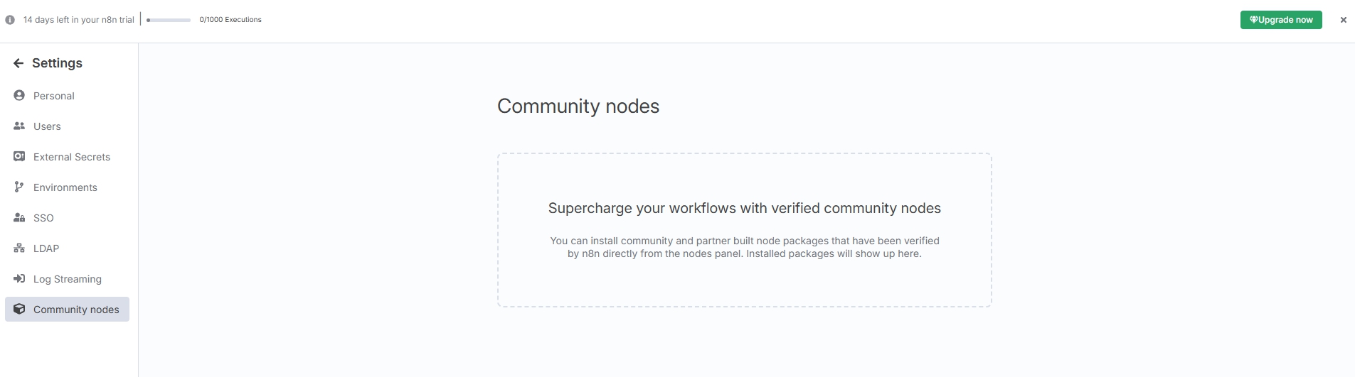 n8n에서 검증한 커뮤니티 및 파트너 제작 노드 패키지를 노드 패널에서 직접 설치할 수 있습니다.