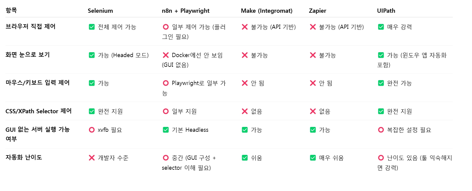 - Make, Zapier는 API 기반이라 셀레니움 수준의 제어는 아예 불가능합니다.